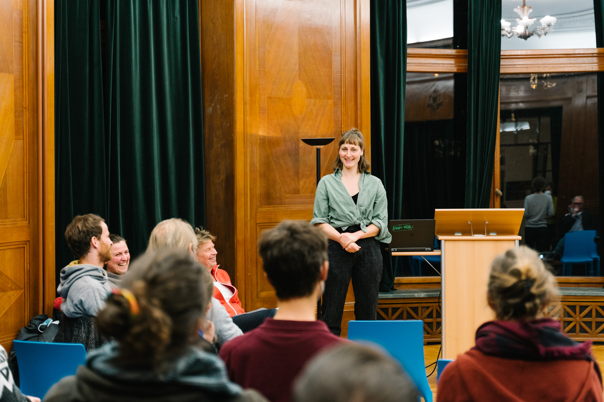 Alle Teilnehmer*innen hatten zu Beginn des Abends die Gelegenheit, einen ersten Blick auf die Ausstellung zu werfen. Anschließend begann das Rahmenprogramm im großen Saal des Instituts français. denkhausbremen-Projektleiterin Jana Otten gab eine Einführung in das Thema Bioökonomie und erläuterte dem Publikum die Hintergründe der Ausstellung. Demnach ist die Produktion von nachwachsenden Rohstoffen nicht per se nachhaltig, so wie es im Zuge der Bioökonomie-Debatte immer wieder behauptet wird, sondern verbunden mit Menschenrechts-verletzungen und Umweltzerstörungen im Globalen Süden.