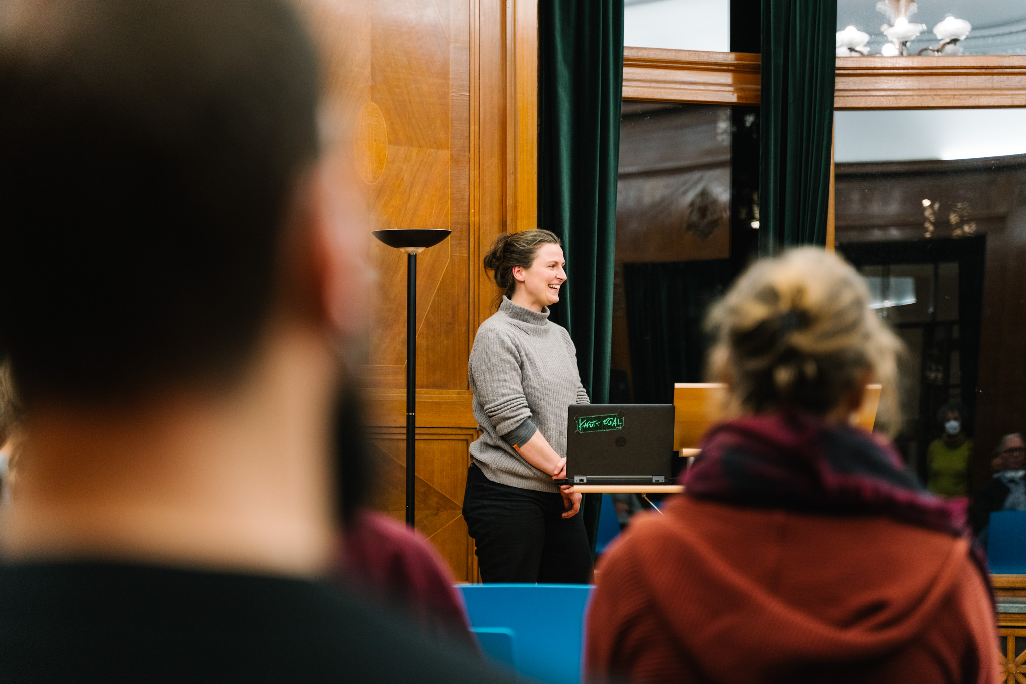 At the beginning of the evening, the audience had the opportunity to take a first look at the exhibition. Afterwards, the program began in the large hall of the Institut français. denkhausbremen project manager Jana Otten gave an introduction to the topic of bioeconomy and explained the background of the exhibition to the audience. According to this, the production of renewable natural resources is not sustainable per se and often linked to human rights violations and environmental destruction in the Global South.